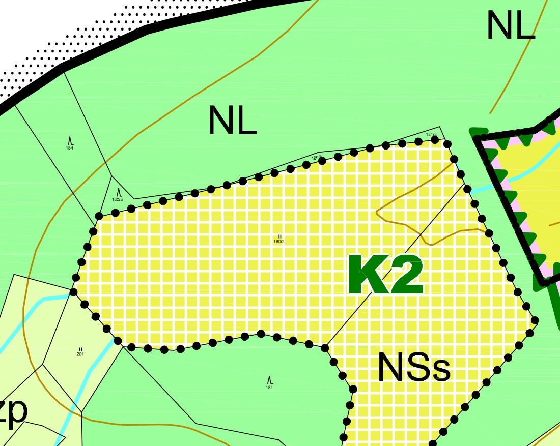 - parc. č. 180/2 – NSs – plochy smíšené nezastavěného území – sportovní, K2 – plochy uvažované pro rozšíření golfového areálu