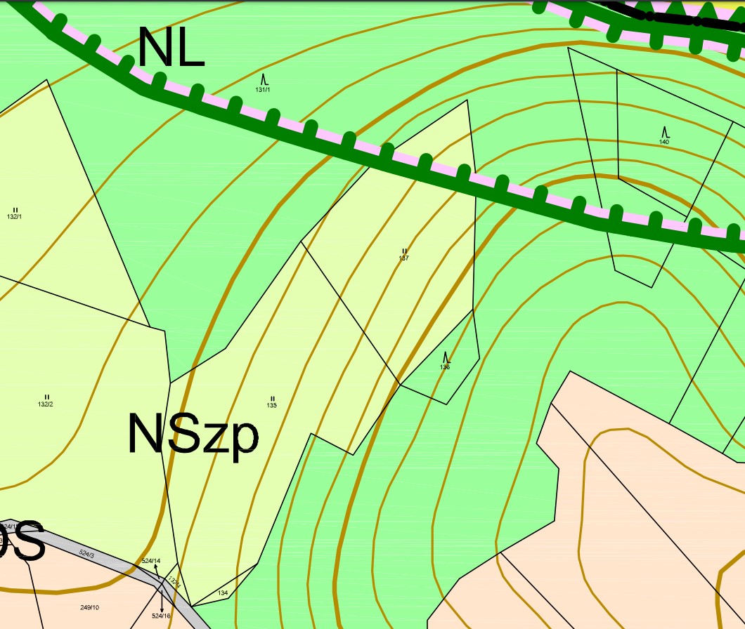 - parc. č. 134, 135, 137 – NSzp – plochy smíšené nezastavěného území – zemědělské, přírodní, přes část pozemku parc. č. 137 vede nadregionální biokoridor (VU1 založení prvků systému ekologické stability – nadregionální biokoridor K 76 Polom – Žákova hora).