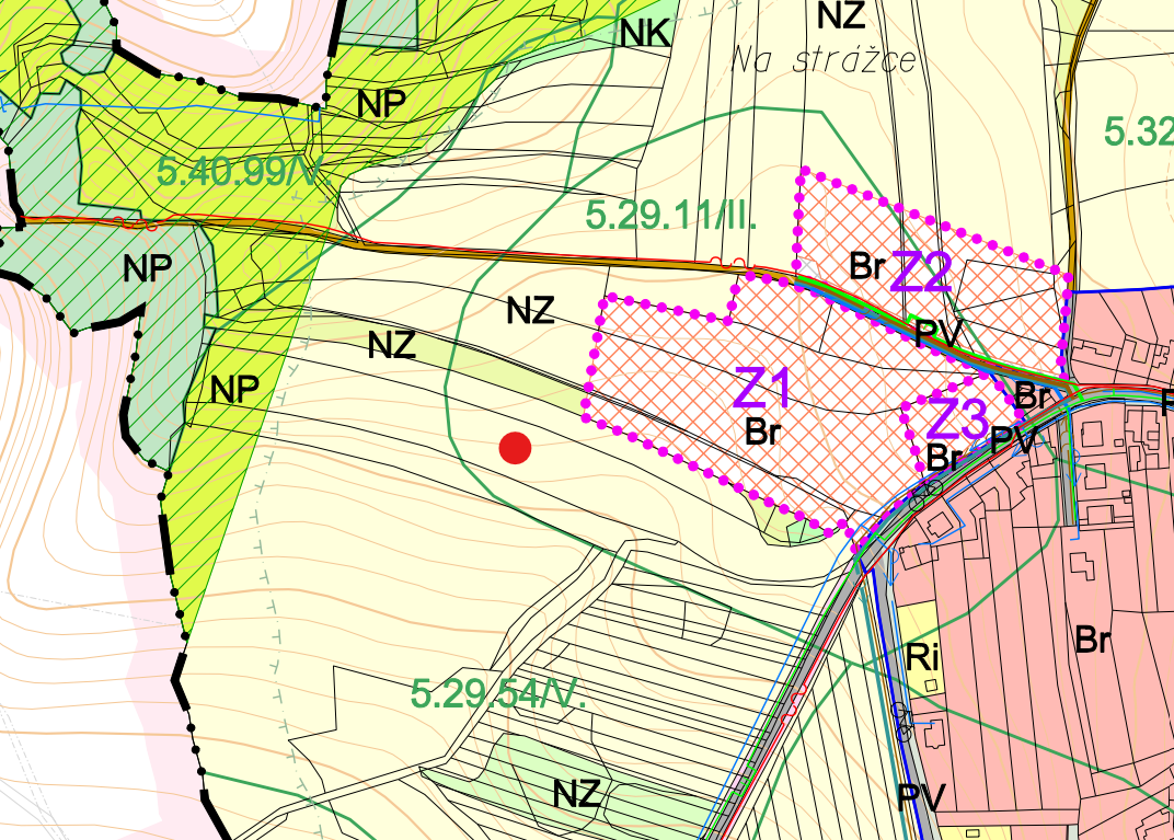 Nabízené pozemky se nacházejí v západní části obce. Dle platného územního plánu obce se pozemky nachází v plochách NZ – plochy zemědělské – orná půda a NP – plochy přírodní, pozemky se nachází u místní komunikace a u ploch pro zastavění rodinnými domy.