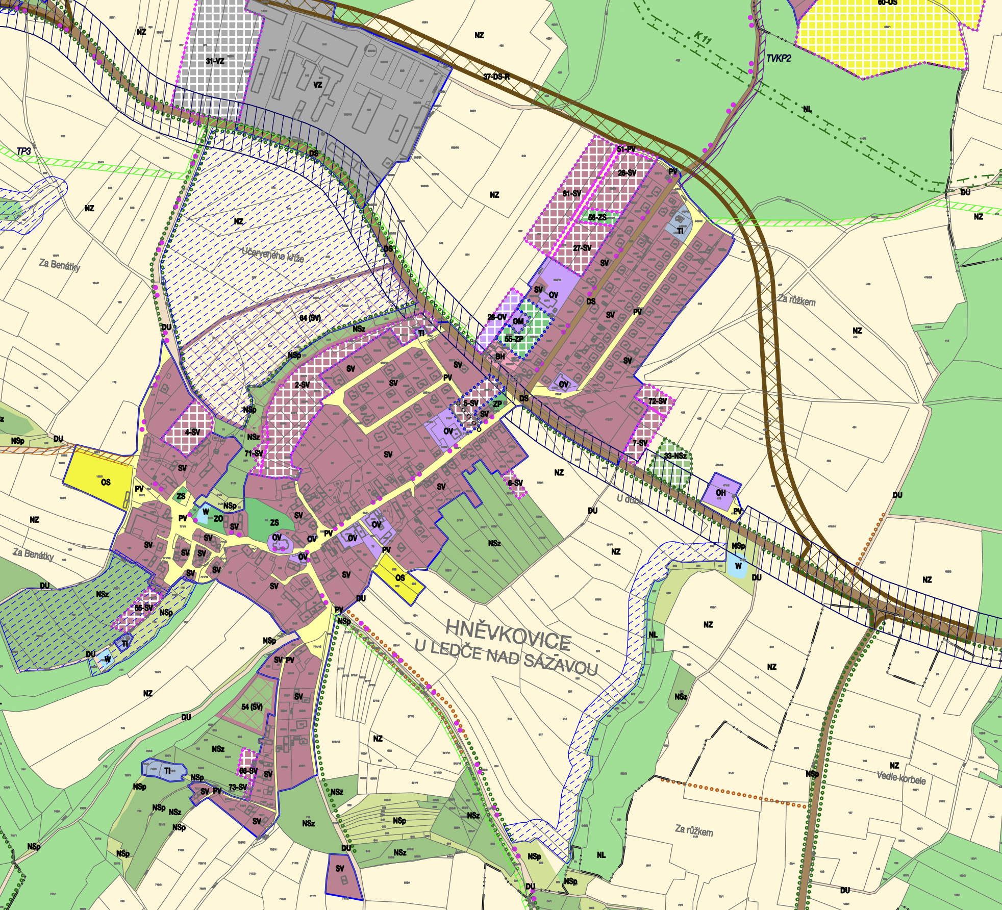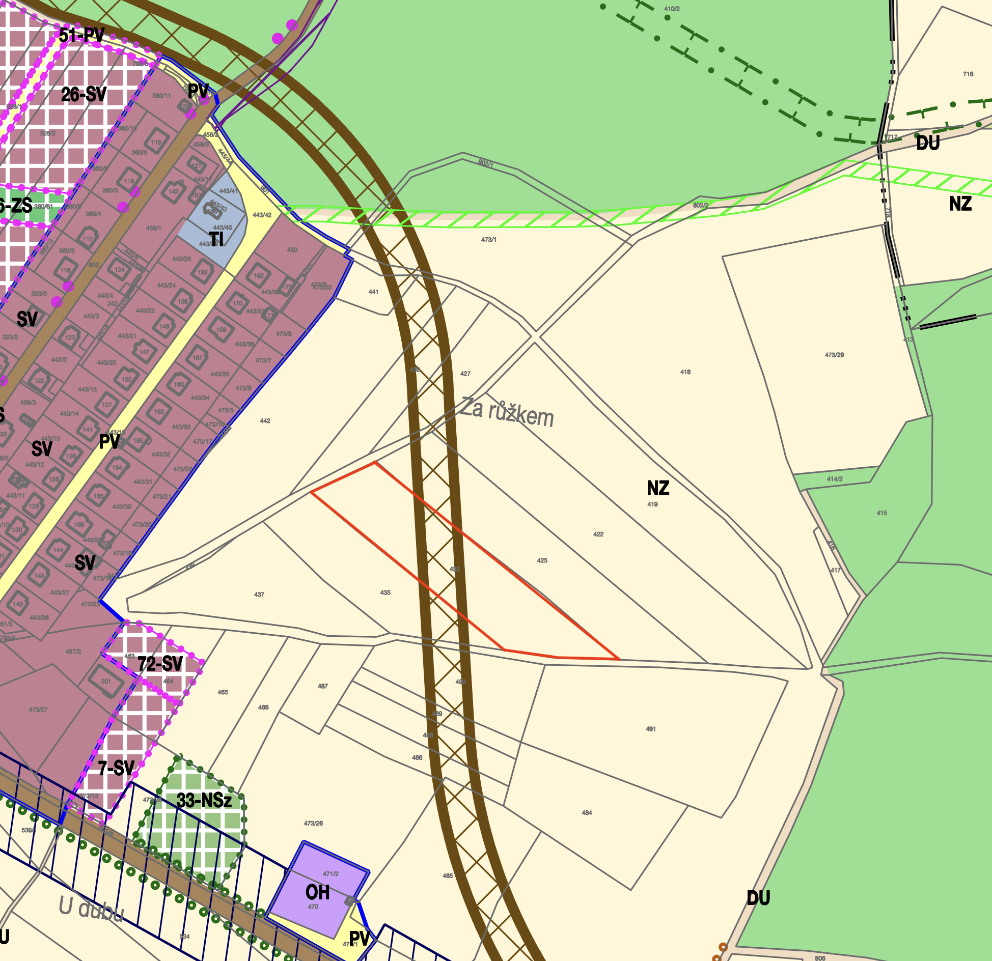 Dle platného územního plánu se pozemek nachází v ploše NZ – plochy zemědělské. Kromě toho je přes pozemek plánována výstavba dopravního koridoru pod označením 37-DS-R. Koridor je vymezený, na základě požadavku obce, z důvodu územní ochrany výhledového řešení přeložky a úpravy trasování silnice II. třídy severně od Hněvkovic.
