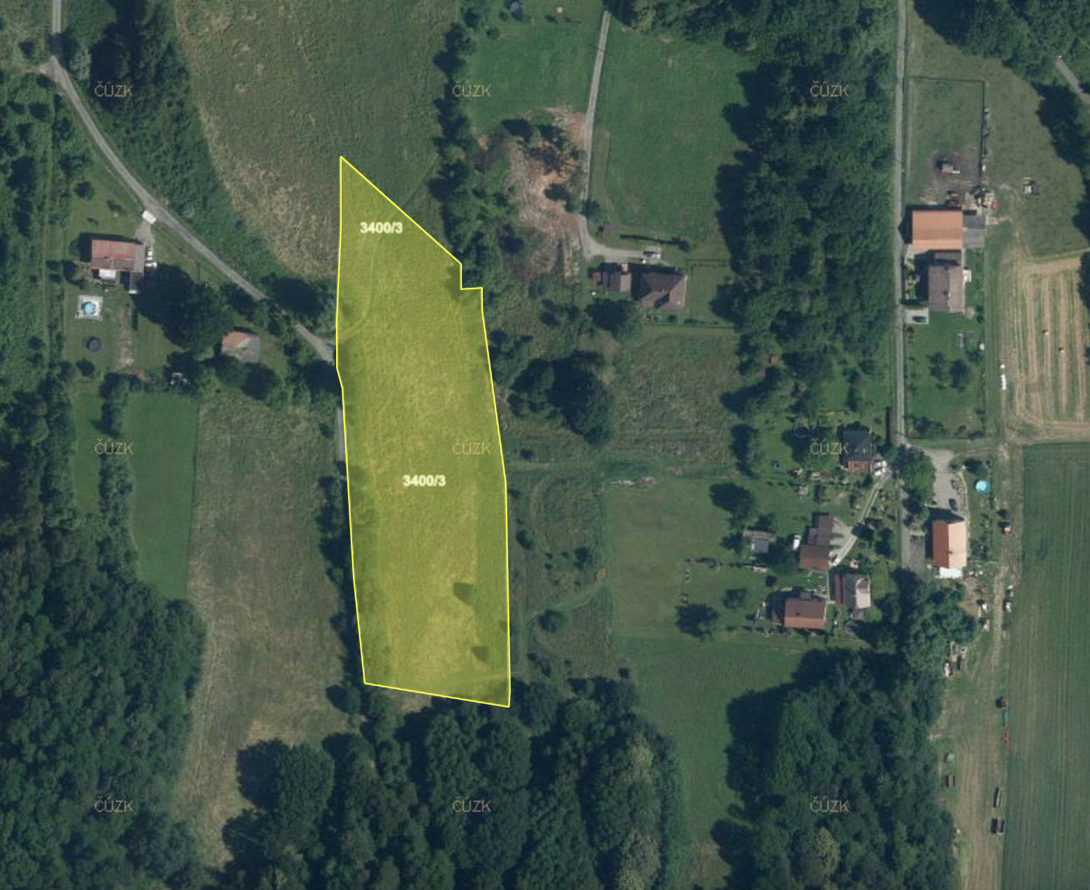 Pozemek parc. č. 3400/3 se nachází v lokalitě Slíny, pod Wilczkovým kopcem. Adresa nejbližšího domu je Dětmarovice 515 – nabízený pozemek se od tohoto domu nachází napravo přes místní komunikaci. Z druhé strany pozemku je pak dům s adresou Dětmarovice 846. Pozemek je z jižní strany ohraničen lesem a na severní straně pokračuje zemědělská půda.
