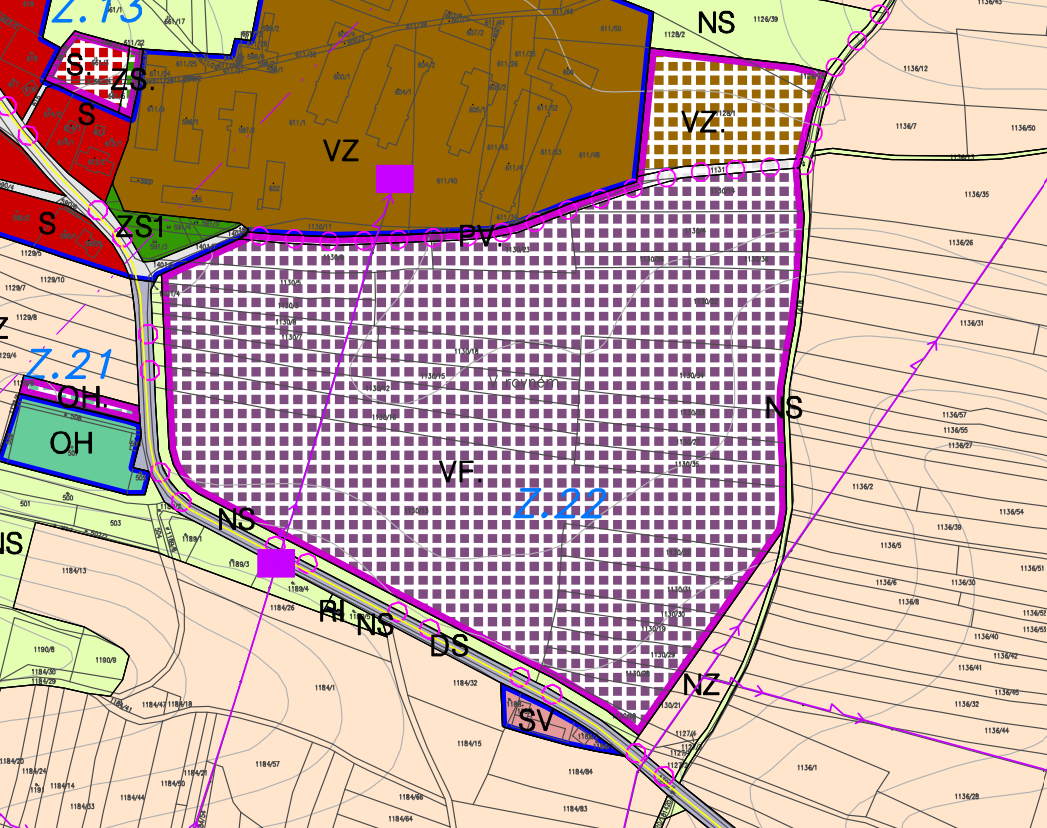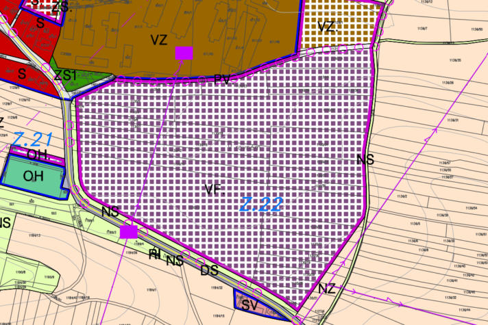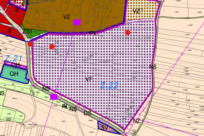 Nabízené pozemky se dle územního plánu nachází v zastavitelných plochách Z.22, které jsou pod označením VF – plochy výroby a skladování – fotovoltaické elektrárny. Tyto pozemky jsou vhodné pro umístění fotovoltaických elektráren – zařízení pro fotovoltaickou výrobu elektřiny. Dále je pak možné využití jako pozemky související s dopravní a technickou infrastrukturou, plochy zemědělské či zeleň. Podmínkou využití zastavitelných plochy Z.22 pro umístění fotovoltaické elektrárny je následné navrácení ploch do původního funkčního stavu (ZPF) po ukončení funkce fotovoltaické elektrárny. Další podmínkou využití se nachází v textové části územního plánu, na straně 18.
