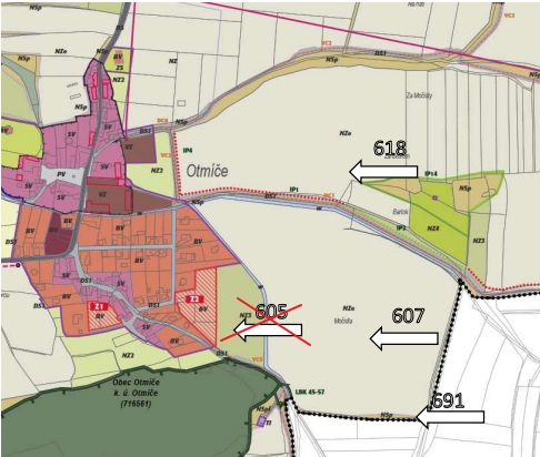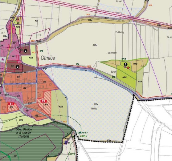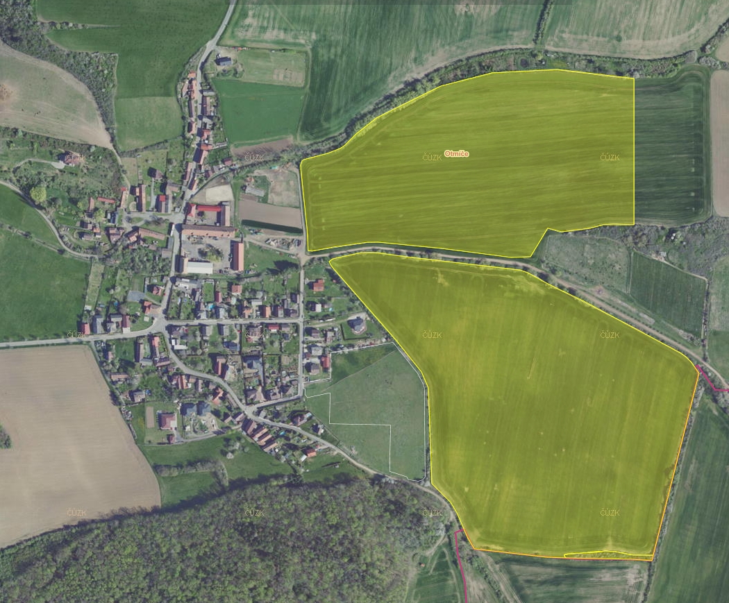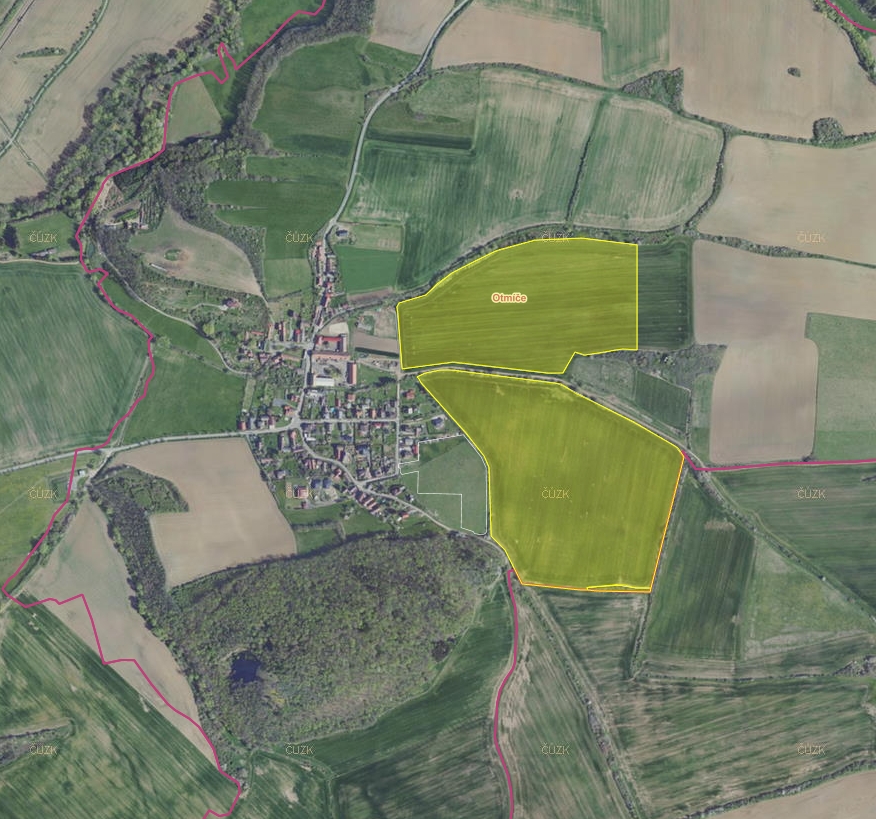 Nabízené zemědělské pozemky, se nachází v těsném sousedství obce mimo její urbanizovanou část. Mezi pozemky vede polní cesta (komunikace), která je ve vlastnictví obce. Po polní cestě vede modrá turistická trasa okolo Otmíčské hory a rozhledny Zvoničky. Současné možnosti využití zemědělských pozemků jsou vypsané v platném územním plánu obce.