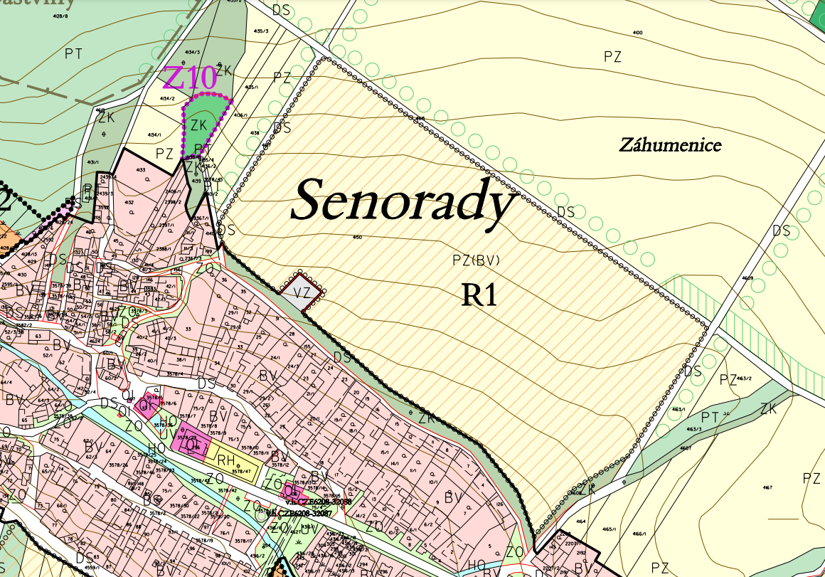 Obec Senorady se nachází cca 35 km jihozápadně od Brna. V obci je zavedená autobusová doprava. Nabízené pozemky se dle platného územního plánu nachází v územní rezervě R1 při severním okraji obce. Územní rezerva R1 je připravená pro využití BV – bydlení venkovské.