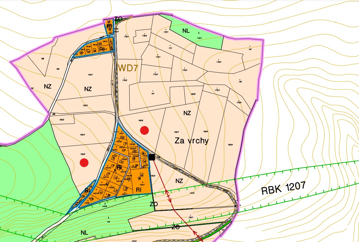 Pozemky tvoří dvě celistvé plochy v těsné blízkosti ploch individuální rekreace – v tzv. části Za vrchy (oddělená část v severní části území. Výhodou pozemků je také dobré situování podél veřejných místních komunikací v majetku obce. Dle územního plánu se pozemky nahází v plochách zemědělských – orná půda – ale díky umístění je možné zvážit změnu účelu užívání, jedná se tak o investiční pozemky dlouhodobého charakteru.
