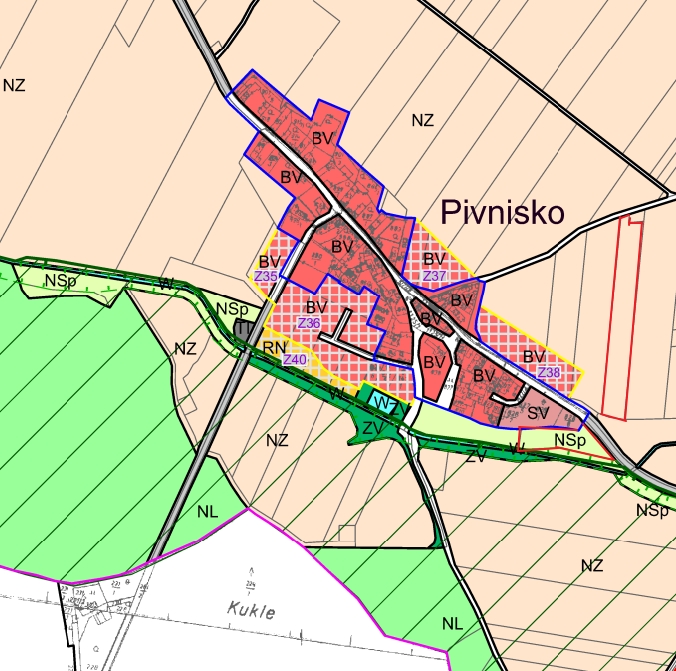 Nabízené pozemky se dle platného územního plánu nachází v plochách zemědělských – NZ (orná půda) a plochách smíšeného nezastavěného území – NSp (trvalý travní porost).